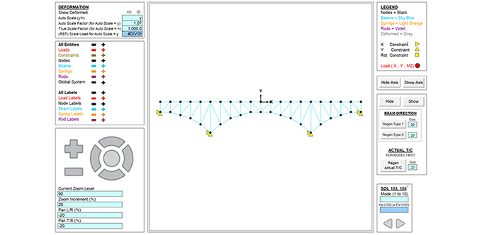 1D Elements© is a user friendly finite element pre/post processor that uses beam, rod, and spring elements in 2D space. It is Excel based and uses VBA (Visual Basic for Applications) to allow for advanced capability. 1D Elements is compatible with the included free MYSTRAN solver (similar to Nastran) or the MSC Nastran solver. This combination is a standard approach to finite element analysis (pre/post processer and a solver).
